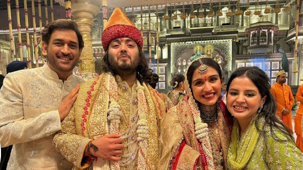 Sakshi Dhoni shared a picture with Anant and Radhika on social media. Alongside her husband MS Dhoni, she wrote, "Radhika and Anant, congratulations on your marriage! May your love continue to shine bright, just like Radhika's smile and Anant's kind heart. May you have a lifetime of happiness, laughter, and adventure together ... lots of love and warmth always from us Dhoni s ❤️❤️❤️❤️❤️????????????????????????."