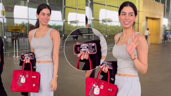 Recently, Khushi Kapoor was seen at the Mumbai airport. She sported grey track pants and a matching tank top, complemented by a bright red handbag. Her hair was tied in a ponytail. While her outfit was stylish, it was her phone wallpaper that grabbed attention.