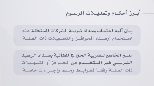 The amendments specify a sequence for settling tax liabilities. Initially, the withholding tax credit balance is used, as outlined in Article (46). If any corporate tax remains, the foreign tax credit under Article (47) is applied next. Should there still be a liability, other incentives or reliefs approved by the Cabinet will be utilised.