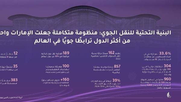 Over five decades, the UAE transformed its air transport sector into a global system with sophisticated infrastructure across all Emirates. This includes 12 certified airports, 100 heliports under development for electric aircraft, and 35 registered air operators. The country has signed 189 bilateral agreements with 97% of the world's countries.