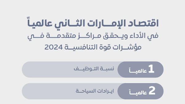 The UAE also achieved 5th place in 13 indicators including GDP (PPP) per capita, quality of air transportation, energy infrastructure, graduates in sciences, start-up procedures, unemployment legislation, foreign highly-skilled personnel, national culture, unemployment rate and tax evasion.
