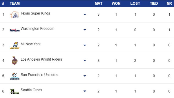 MLC Points Table Update: Texas Super Kings Rise After July 11 Match