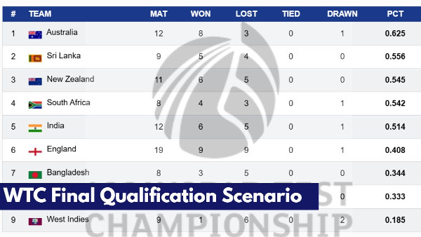 The qualification scenarios for each team depend on their remaining matches and the outcomes of other key contests. Let's first examine the current WTC 2023-25 standings: