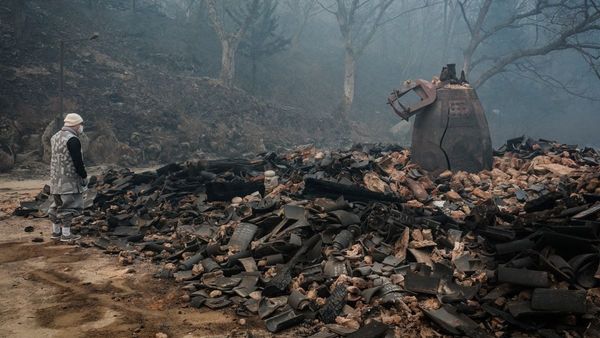 As wildfires rage through South Korea's southeast, causing unprecedented destruction, a historic Buddhist temple, the Gounsa Temple, has been obliterated. The blaze, which has claimed at least 18 lives, saw the temple in Uiseong County, over 200 km southeast of Seoul, reduced to ashes. The only item left somewhat intact was its ceremonial bell, amidst the ruins. The Jogye Order of Korean Buddhism shared photos revealing the extent of the devastation.