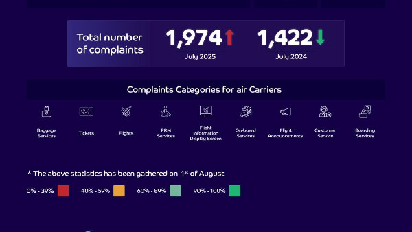 The General Authority of Civil Aviation (GACA) has released its air transport service index for July 2025, highlighting passenger complaints against airlines and airports. A total of 1,974 complaints were lodged with GACA during this period. Saudia emerged as the top airline with the fewest complaints, recording 31 per 100,000 passengers and achieving a 98% resolution rate.
