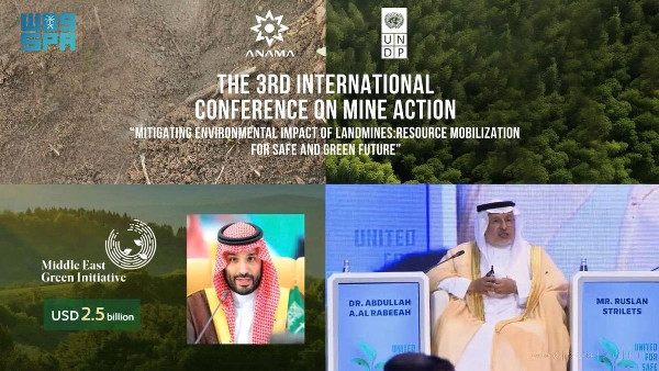 Dr. Al Rabeeah highlighted the Middle East Green Initiative, announced by HRH the Crown Prince and valued at $2.5 billion. The initiative aims to lead the Kingdom and the region in protecting land and nature while addressing environmental challenges. Dr. Al Rabeeah made these statements during his participation in the third annual International Conference on Mine Action, held in Baku, Azerbaijan, on May 30 and 31 under the theme "Mitigating the Environmental Impact of Landmines: Resource Mobilization for a Safe and Green Future."
