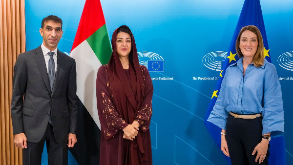 Reem Al Hashimy, Minister of State for International Cooperation, and Dr. Thani Al Zeyoudi, Minister of State for Foreign Trade, met with Roberta Metsola, President of the European Parliament. The meeting took place at the European Parliament headquarters. Discussions focused on enhancing UAE-EU relations, particularly in trade, climate issues, and security matters.