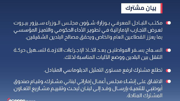The leaders explored opportunities to enhance economic and investment sectors through joint initiatives. They agreed on knowledge exchange and government development as key areas for collaboration. The Government Experience Exchange Office from the Ministry of Cabinet Affairs will visit Beirut to share best practices in government performance and institutional excellence.